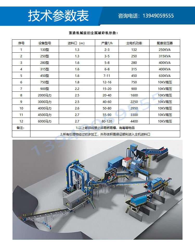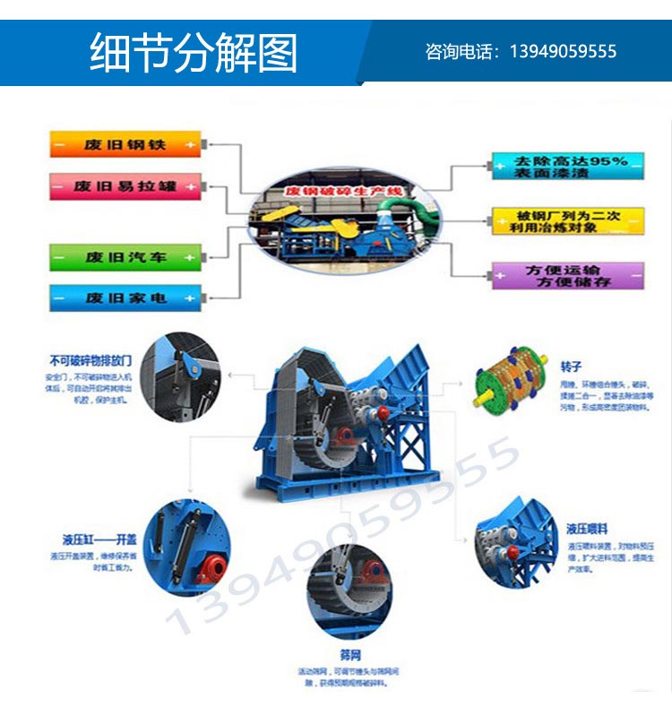 整條廢鋼破碎機生產線由進料輸送機—主機—出料輸送機—磁選輸送機—分料輸送機—除塵—操作柜組成。從廢鋼破碎機出來的破碎物,